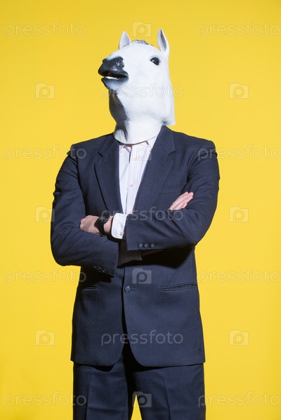 Мужчина в костюме и лошадиной маске на желтом фоне. Концептуальный бизнес фон