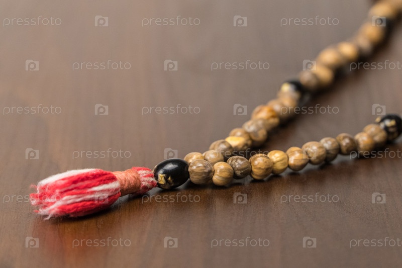 Мусульманские четки, изолированные на деревянном фоне. Исламские и мусульманские концепции