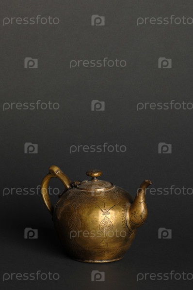 Древний восточный металлический чайник на темном фоне. старинная бронзовая посуда