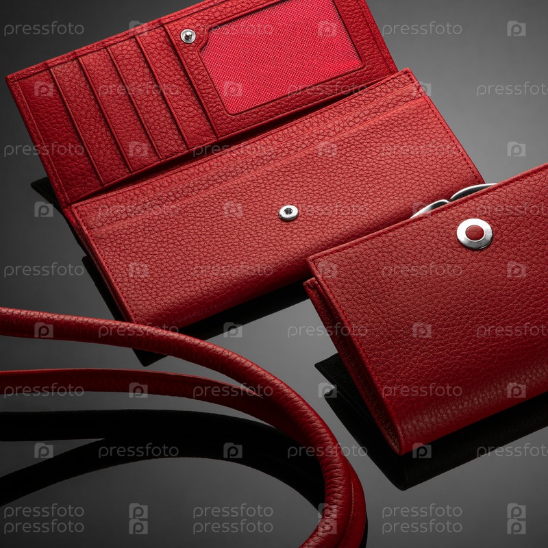 Модный красный кожаный женский кошелек на темном фоне