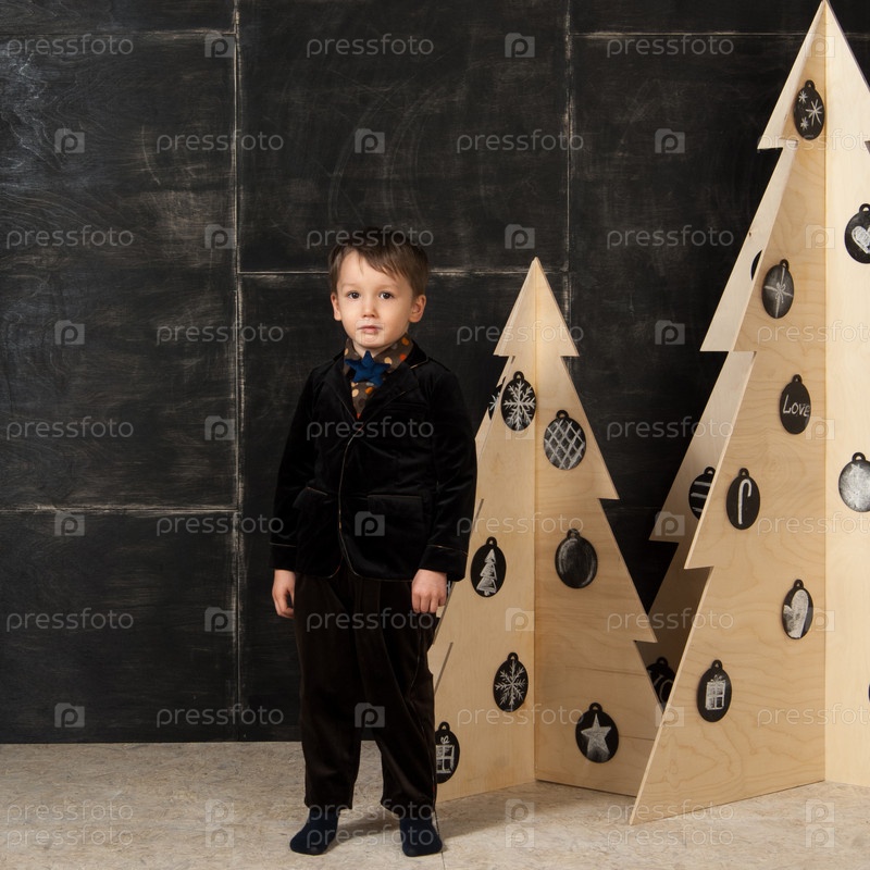 На темном фоне маленький мальчик позирует в стильном костюме возле елки из дерева