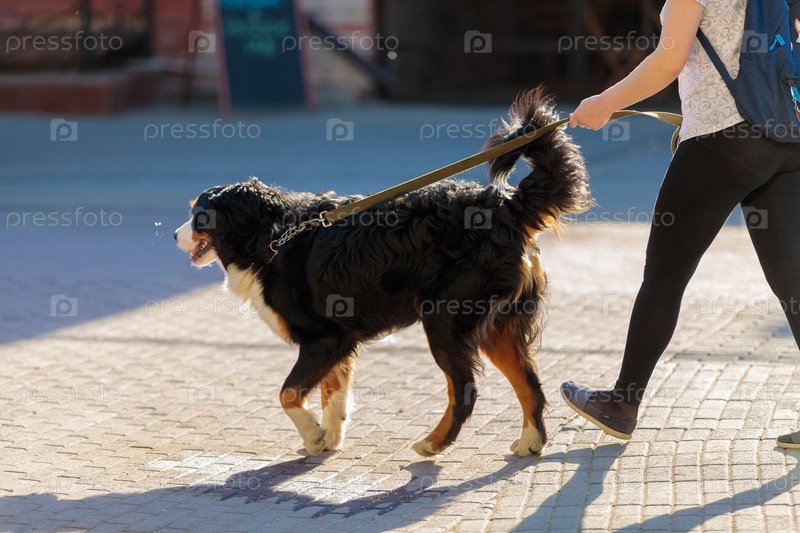 Девушка гуляет по городу с большой собакой. Выгуливать собаку на поводке