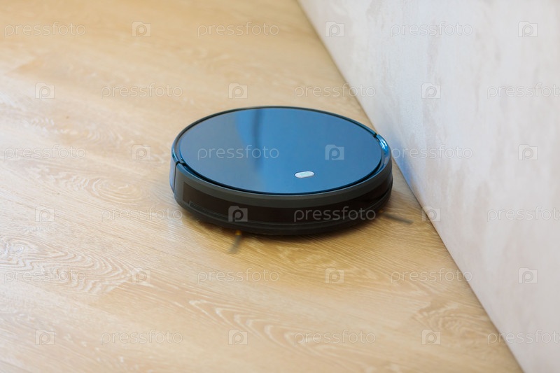 Круглый робот-пылесос собирает мусор с пола в гостиной