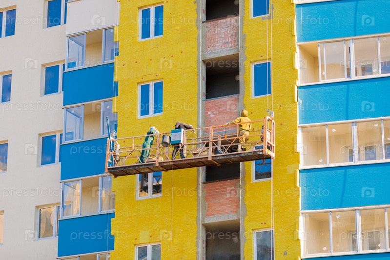 Рабочие на передвижной платформе утепляют стены дома минеральным утеплителем