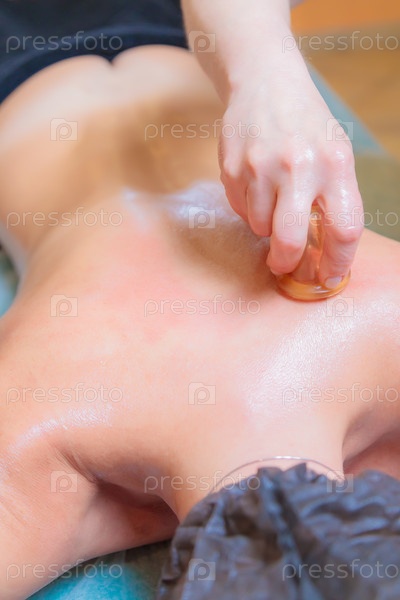 Мастер хиджамы делает массаж спины вакуумным баллончиком
