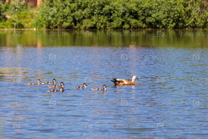 Днем утята плавают в пруду под присмотром утки