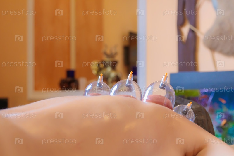 Мастер хиджамы проводит процедуру вакуумного отсасывания крови для молодой девушки