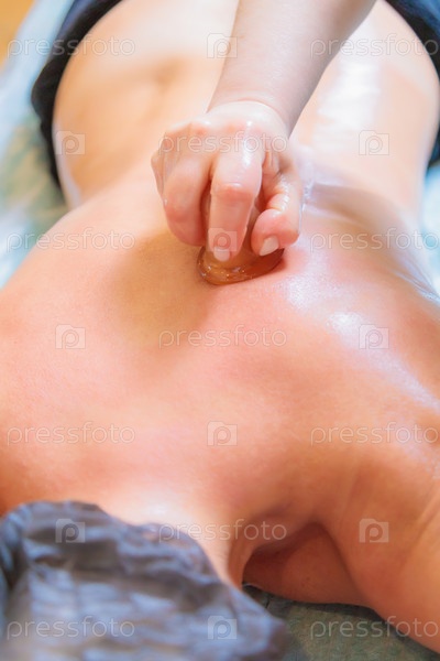 Мастер хиджамы делает массаж спины вакуумным баллончиком