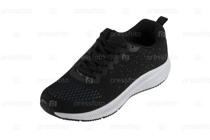 Черные кроссовки из ткани с белой подошвой на белом фоне. Спортивные туфли