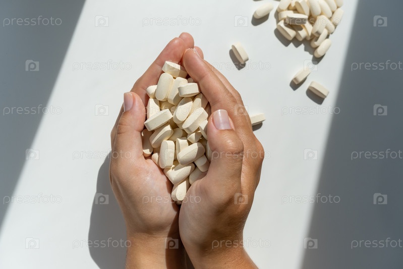 Руки доктора держат много витаминных капсул или таблеток с лекарствами. Здравоохранение или медицинская концепция