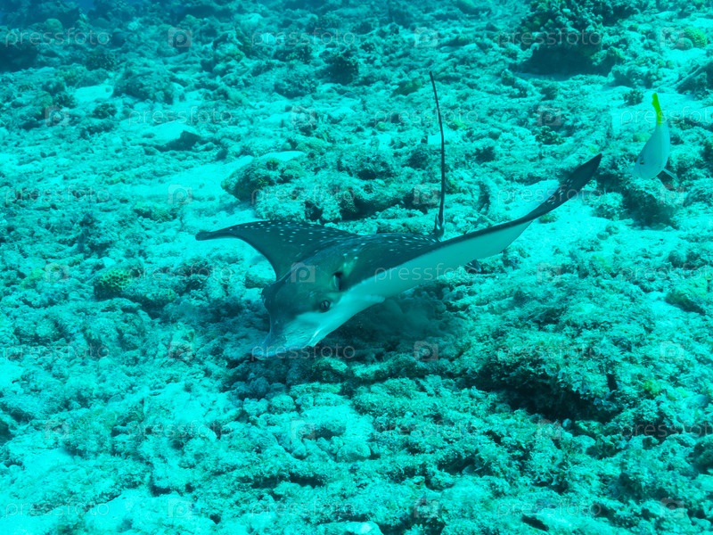 Белый пятнистый орлиный скат или Aetobatus narinari в глубинах Индийского океана, Мальдивские острова, концепция путешествия