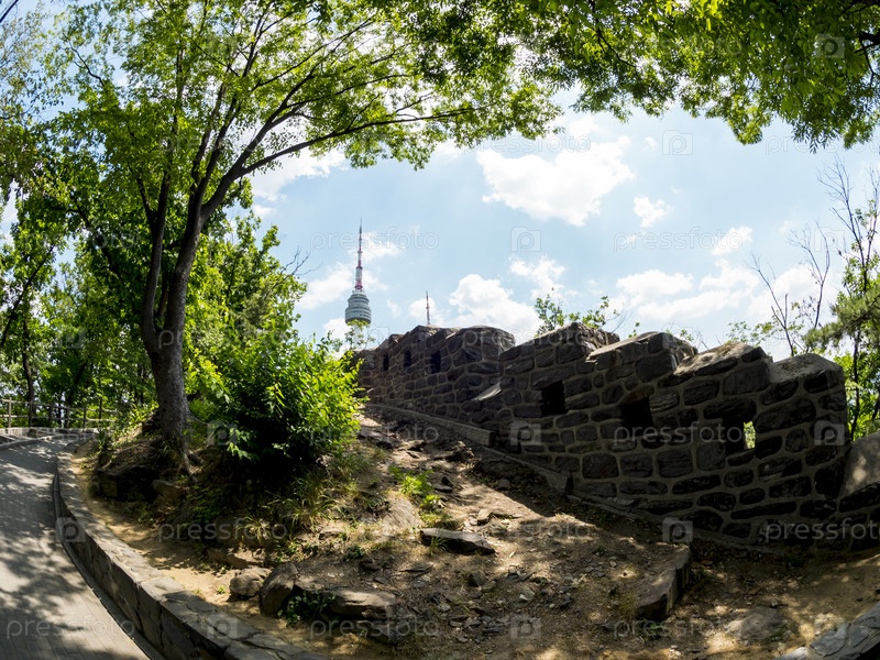 Башня Намсан возле городской стены Сеула в парке Намсан в Сеуле, Южная Корея
