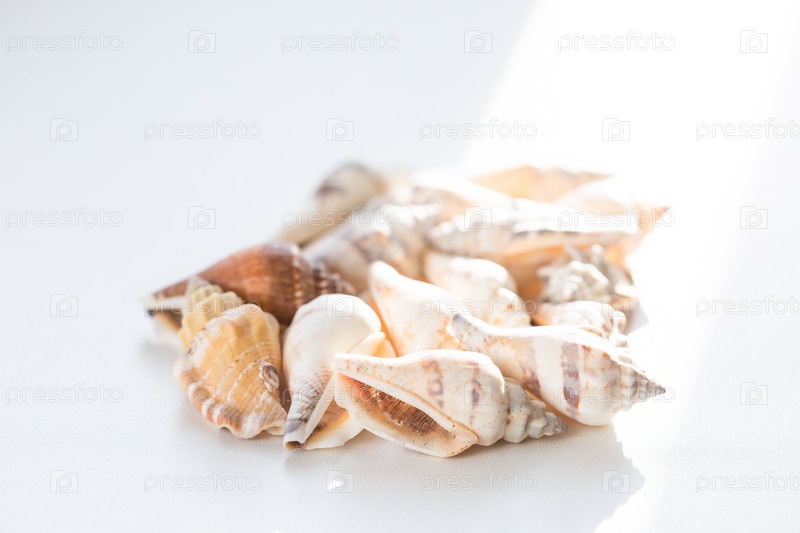 Куча многих красивых морских раковин на белом фоне, вид сбоку. Концепция летнего путешествия