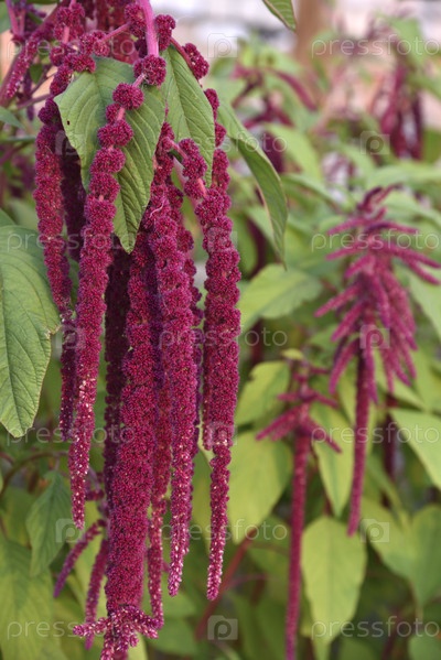 Декоративные цветы амаранта на зеленом кусте в летнем саду. Красивые красные висячие цветы амаранта