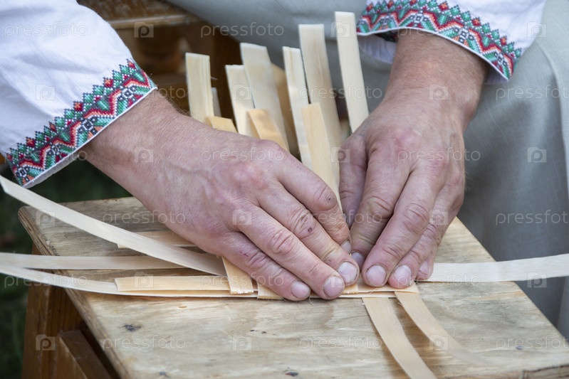 Руки мастера плетут корзину из березовой лозы