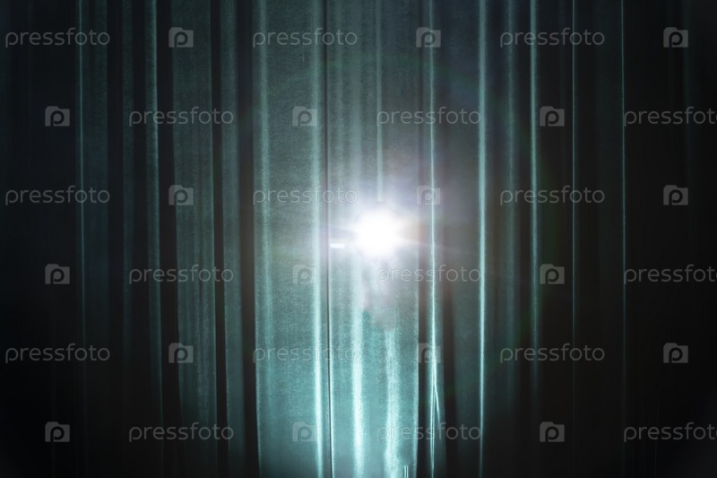 Фон темно-зеленого театрального занавеса с лучом от источника света. Сценический фон