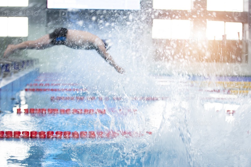 Размытый человек не спортсмен ныряет в бассейне в воду