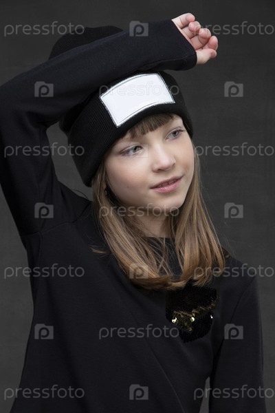 Портрет красивой девочки-подростка в темной одежде на сером фоне. Десятилетняя девочка позирует