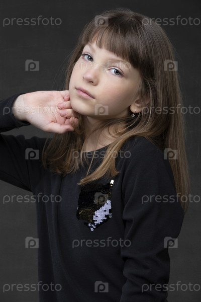 Красивая маленькая девочка смотрит в камеру на сером фоне