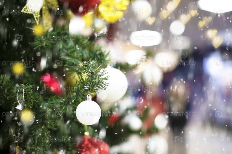 Рождественская елка с игрушками на фоне боке. Рождественский январский фон