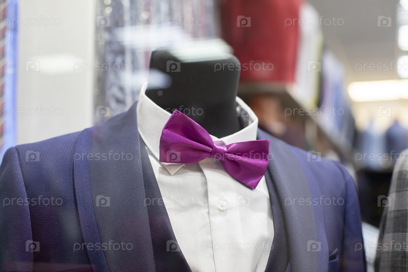 В витрине манекен в строгом костюме и галстуке-бабочке