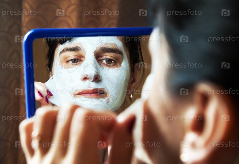 Молодая женщина берет маску красоты перед зеркалом