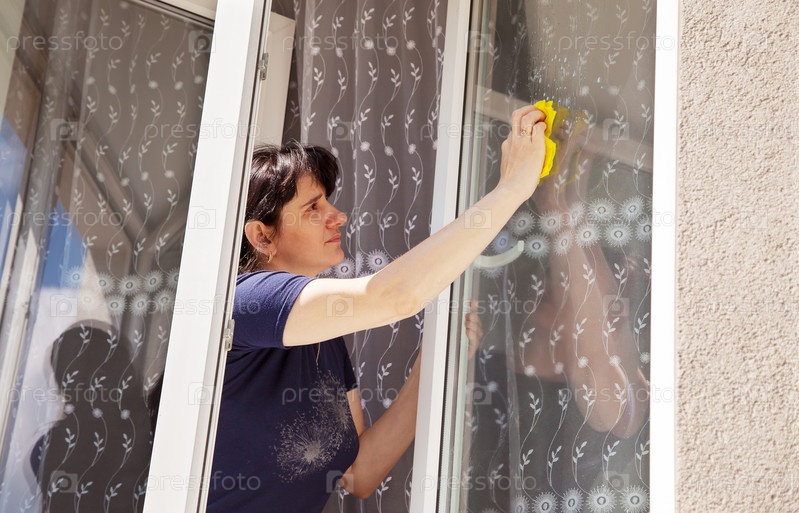 Женщина моет оконное стекло