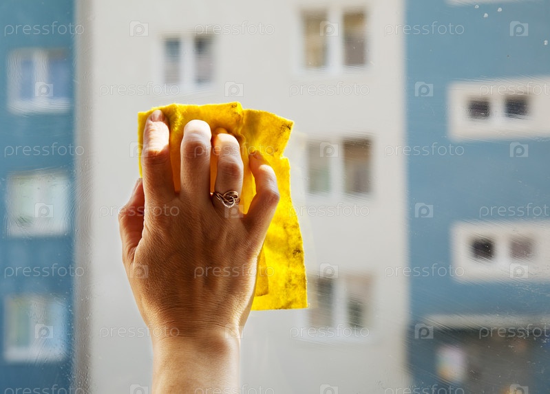 Женская рука моет оконное стекло