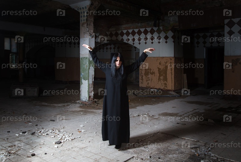 Готическая брюнетка поднимает руки, стоя в большом пустом зале