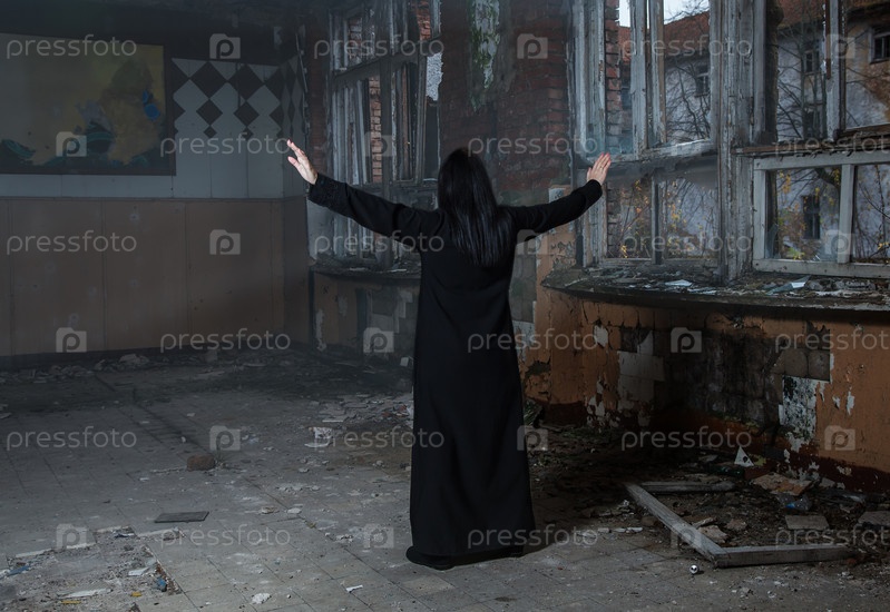 Готическая брюнетка поднимает руки, стоя в большом пустом зале