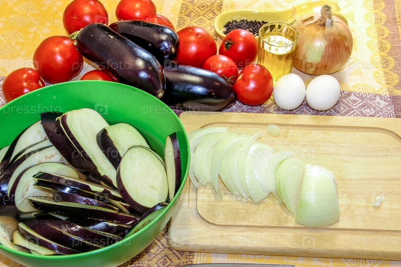 Нарезанный лук на разделочной доске и баклажаны, вымоченные в подсоленной воде в миске. Свежие овощи для приготовления легкого ужина, мусака - традиционное греческое блюдо пошаговый процесс приготовления