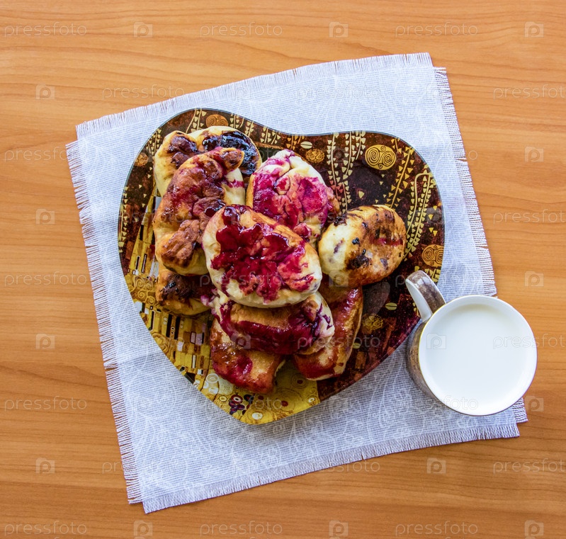Ягодный пирог, обжаренный на сковороде в масле с вишней на блюдце и кружкой молока