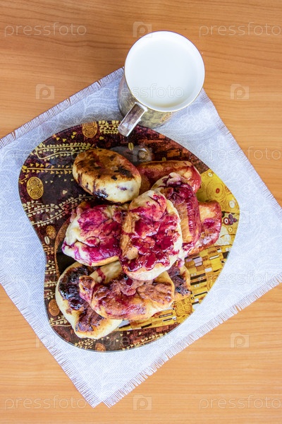 Ягодный пирог, обжаренный на сковороде в масле с вишней на блюдце и кружкой молока