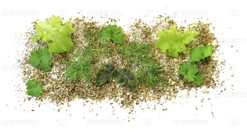 Свежие специи базилик, укроп, петрушка, размещенные в морской соли на белом фоне