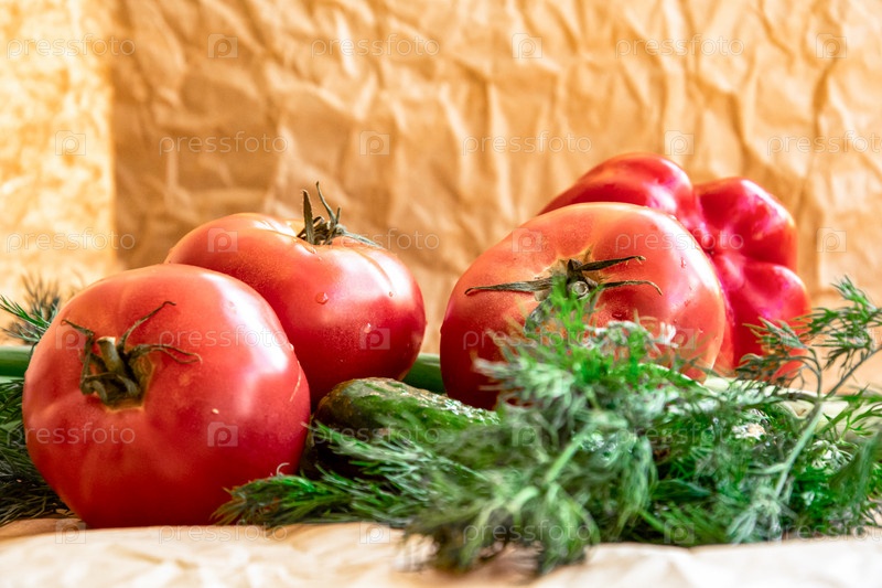 Расположение на оберточной бумаге ассортимента свежих овощей, красного перца, чеснока, зеленого лука, помидоров, огурцов