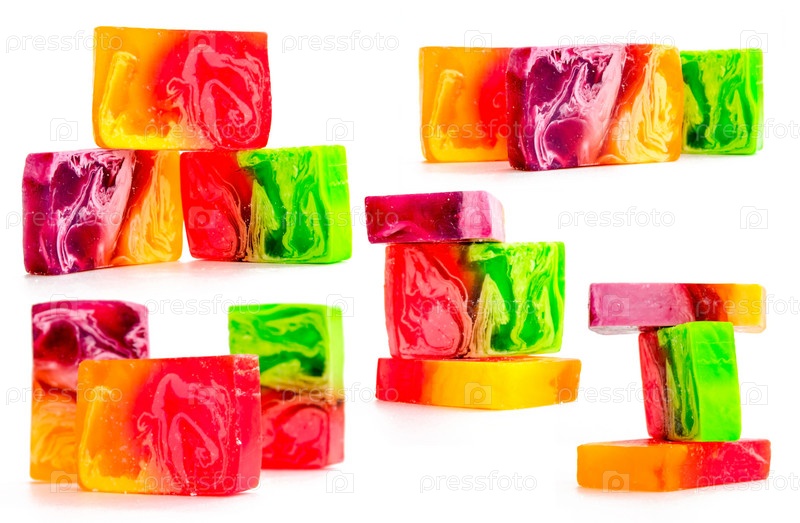Кусок яркого мыла ручной работы. Крупный план на белом фоне