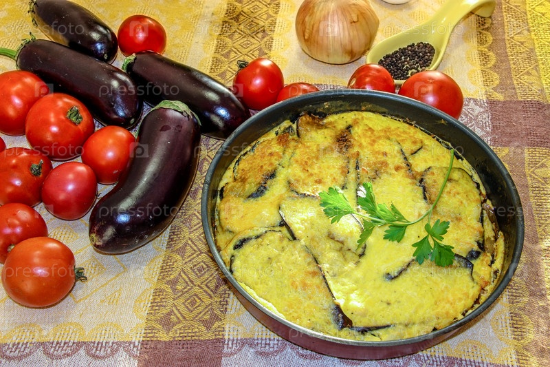 Горячая готовая мусака в форме для запекания среди овощей и пряных трав. Свежие овощи для приготовления легкого ужина, мусака – традиционное греческое блюдо пошаговый процесс приготовления; овощная запеканка, рагу