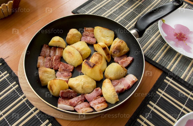 Жареные кусочки запеченного золотистого картофеля и красного блестящего, из топленого жира, ломтики бекона
