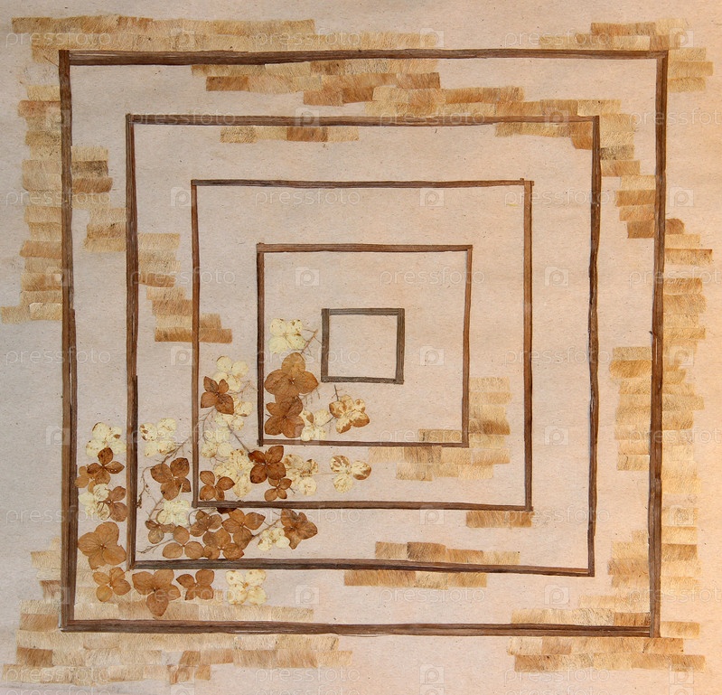 Икебана, гортензия, листья ириса из соломенной кукурузы, сухие осенние листья растений и ветки фона для альбома, деревянные доски, объект,