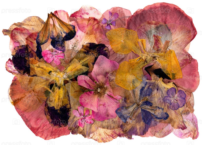 Пестрая разноцветная аппликация полянка из сушеных прессованных цветов гладиолуса
