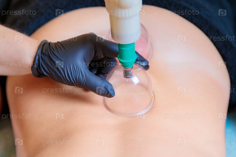 Мастер хиджамы проводит процедуру вакуумного отсасывания крови для молодой девушки