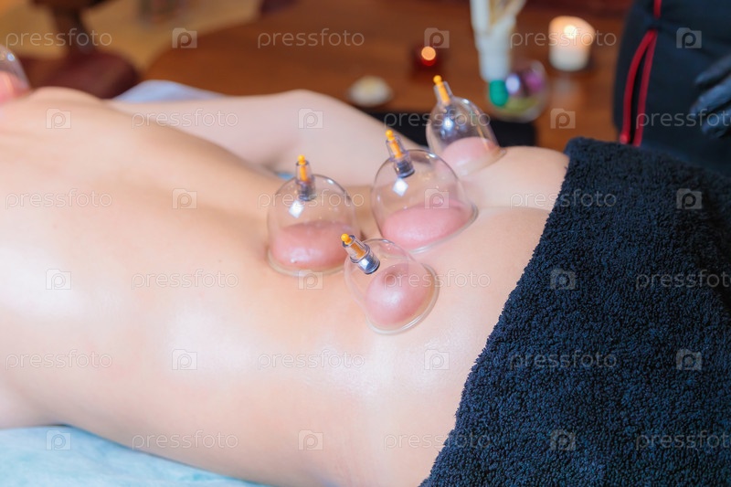 Мастер хиджамы проводит процедуру вакуумного отсасывания крови для молодой девушки