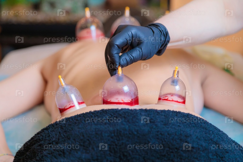 Мастер хиджамы проводит процедуру вакуумного отсасывания крови для молодой девушки