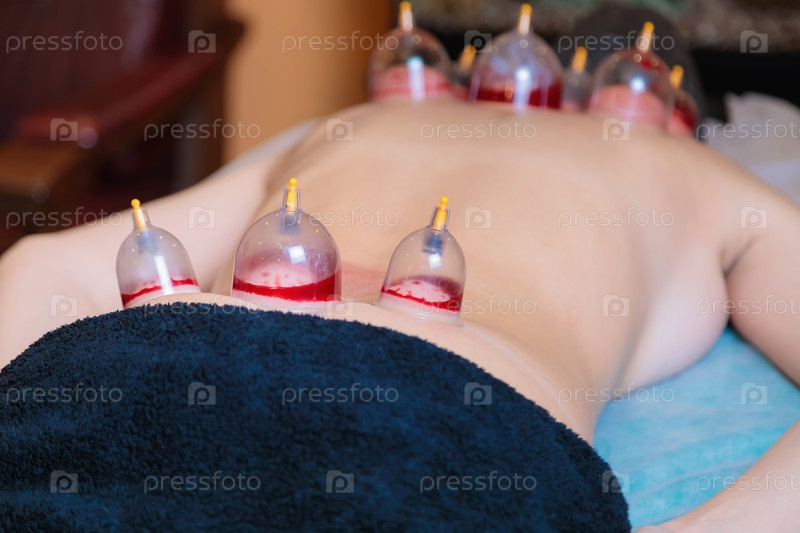 Мастер хиджамы проводит процедуру вакуумного отсасывания крови для молодой девушки