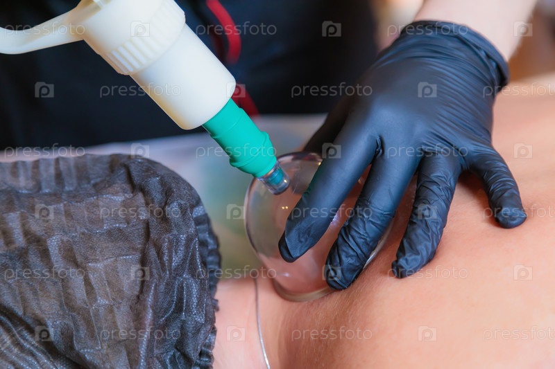 Мастер хиджамы проводит процедуру вакуумного отсасывания крови для молодой девушки