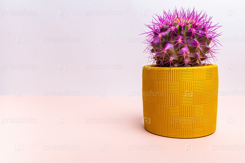 Круглый кактус с большими фиолетовыми шипами в желтом горшке