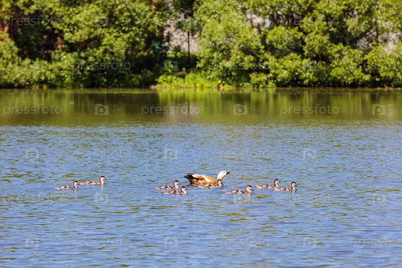 Днем утята плавают в пруду под присмотром утки