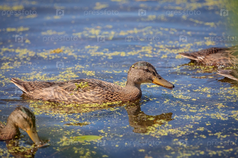 Днем по пруду плавает дикая утка. Крупный план