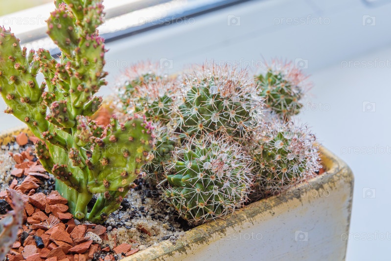 Набор цветов кактуса в одном горшке. Композиция из кактусов