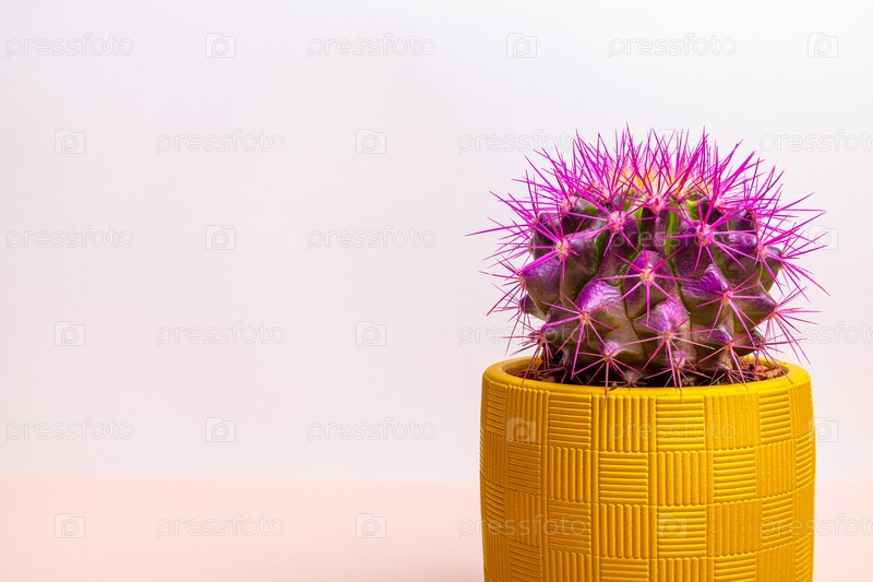 Круглый кактус с большими фиолетовыми шипами в желтом горшке